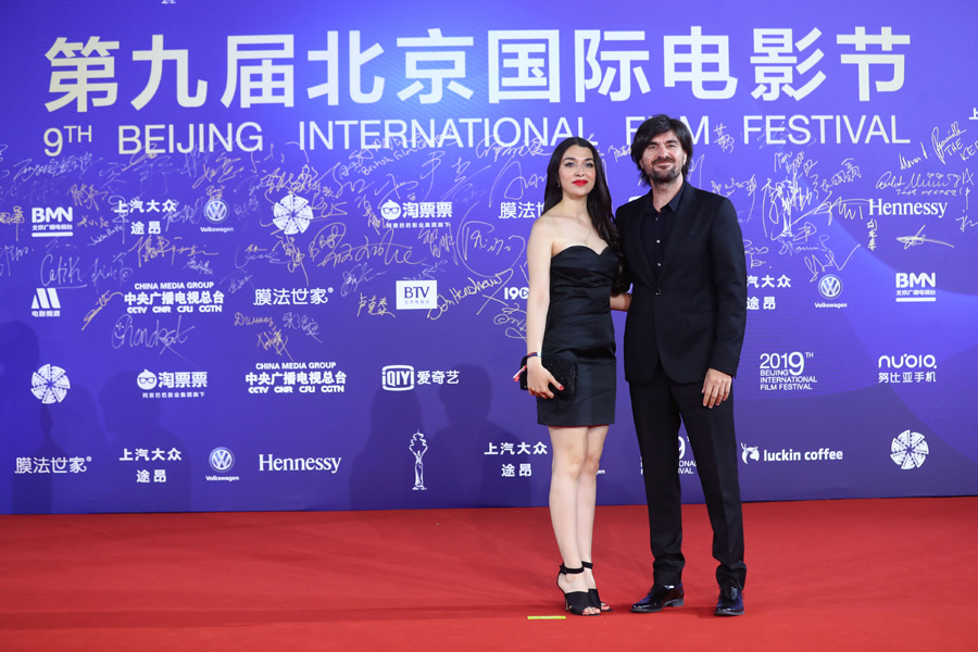 Actors in Le Poirier Sauvage pose for photos on the red carpet for the closing ceremony of the ninth Beijing International Film Festival in Beijing, April 20, 2019. [Photo/Xinhua]