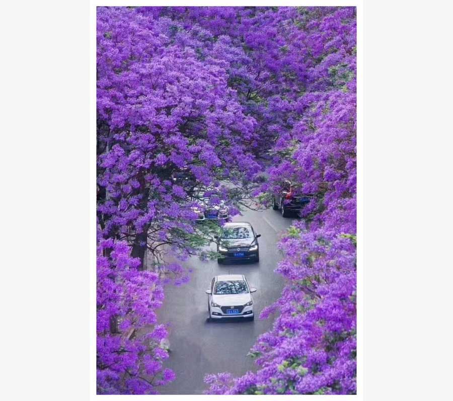 Blooming blue jacaranda attracts tourists nationwide, who pour into Kunming city in Southwest China's Yunnan province every April. The brightly colored blooms create a romantic landscape on the city's streets. The petals of the purple flower fill the air when they fall off the trees and gently float to the ground below. [Photo by Xie Quanming/provided to chinadaily.com.cn]