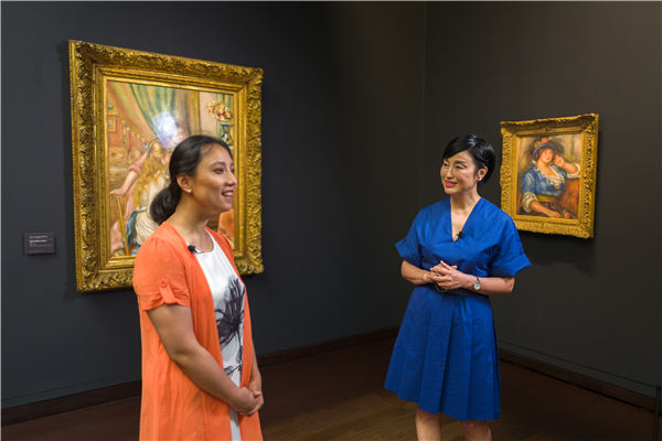 Presenter Huang Jingjie (right) and writer Zou Fanfan introduce the artworks in the Orsay Museum. [Photo provided to China Daily] |