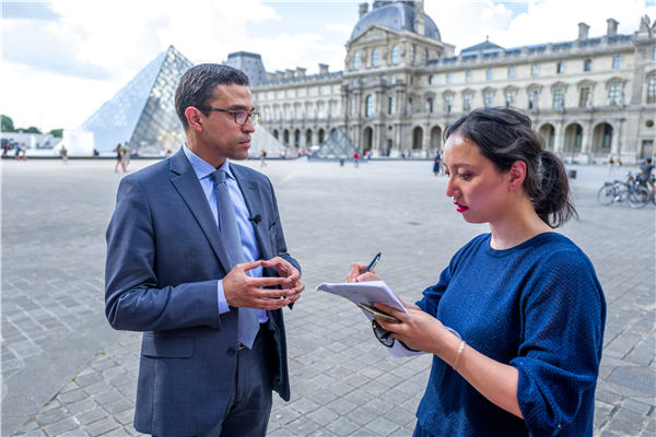 Writer Zou Fanfan (right) interviews Adel Ziane, director of public relations at the Louvre Museum, for the program. [Photo provided to China Daily] |