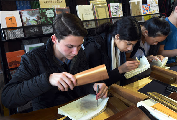 The course in stitched bookbinding started in March, and the Sidwell students are the first group to take it. A two-hour session costs 360 yuan ($54) for each student and is held at weekends at the bookstore in Tianqiao, Beijing.