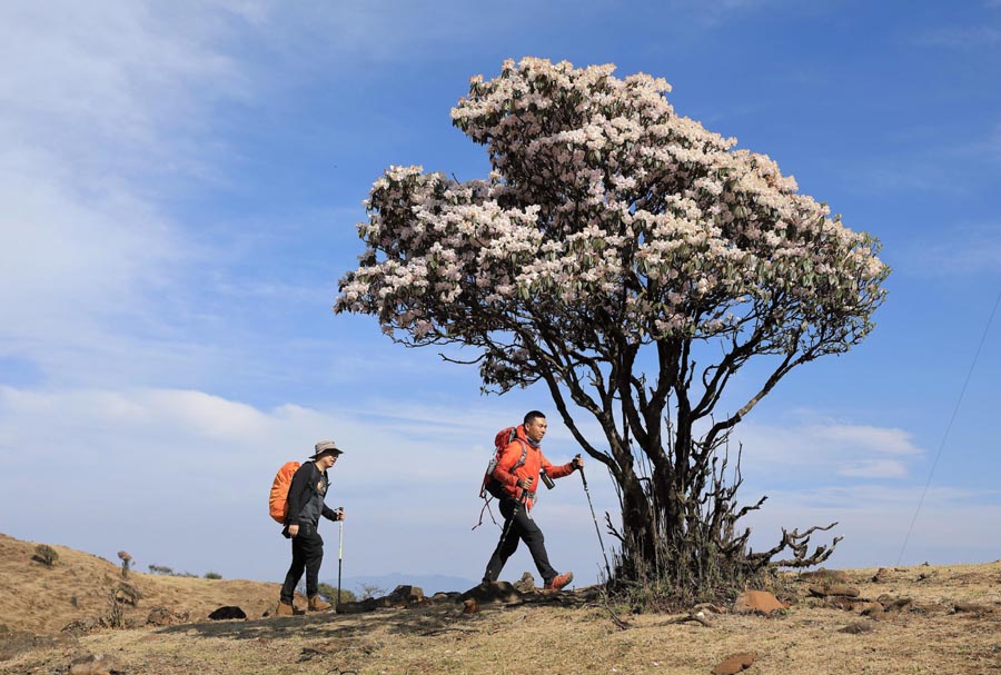 Tourists hike at Longtou Mountain in Yuanbian county, Panzhihua city, Southwest China's Sichuan province, on April 23, 2019. [Photo/Xinhua]