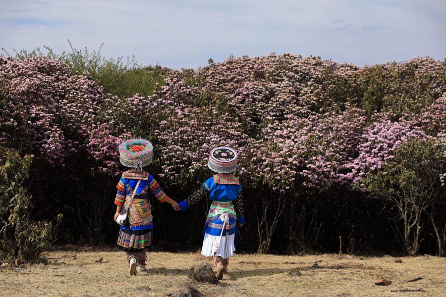 Two girls dressed in traditional costumes of the local Miao ethnic group pose for photos in front of azaleas at Longtou Mountain in Yuanbian county, Panzhihua city, Southwest China's Sichuan province, on April 23, 2019. [Photo/Xinhua]