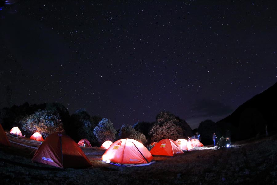 Tourists camp at Longtou Mountain in Yuanbian county, Southwest China's Sichuan province, on April 23, 2019. [Photo/Xinhua]