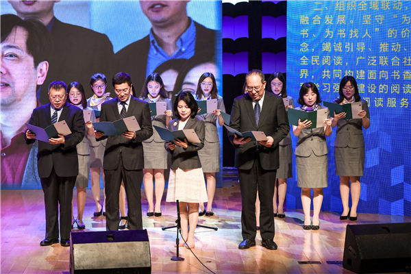 Employees of the National Library of China read a proposal at the Wenjin Book Award in Beijing on Tuesday, calling for more reading time for the public. [Photo provided to China Daily] |