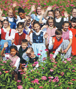 A children's choir from the Vienna State Opera pay a visit to a scenic area in Suqian, Jiangsu province. [Photo by Zhou Guoqiang/For China Daily] |