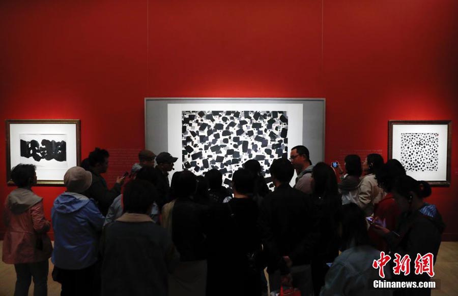 Attendees look at a Wu Guanzhong painting in Beijing, April 25, 2019. [Photo/Chinanews.com]