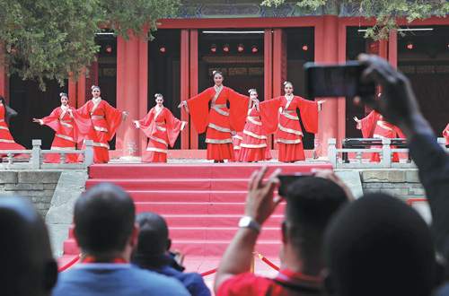 Performers stage Dacheng Etiquette at the Imperial College in Beijing on Tuesday. [Photo by Wang Zhuangfei/China Daily] |