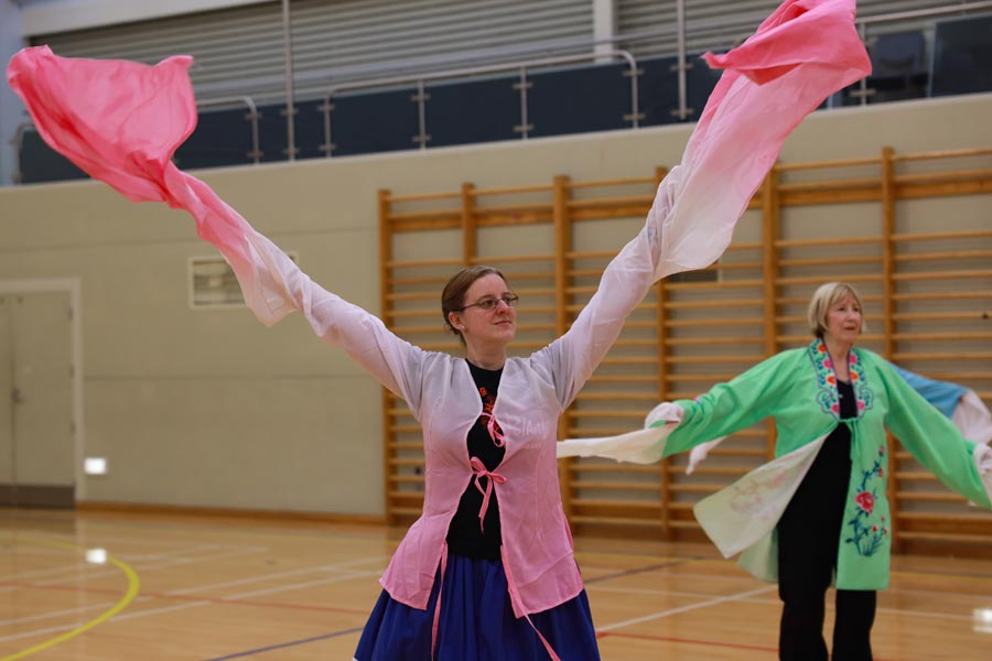 Students learn a Chinese folk dance at Chilton Saint James School, Wellington, April 28, 2019. In celebration of International Dance Day, nearly 100 people from more than 10 folk dance associations from different countries, including China, New Zealand, Russia, Brazil, Spain and Bulgaria, took part in the event to showcase and learn different dancing styles. [Photo/Chinaculture.org]