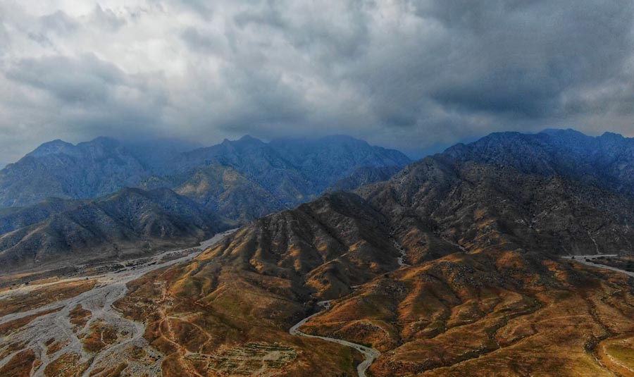 An aerial photo captures Helan Mountain after rainfall on May 9, 2019, as clouds shroud colorful mountaintops to form a picturesque view. [Photo by Su Yong/chinadaily.com.cn]
