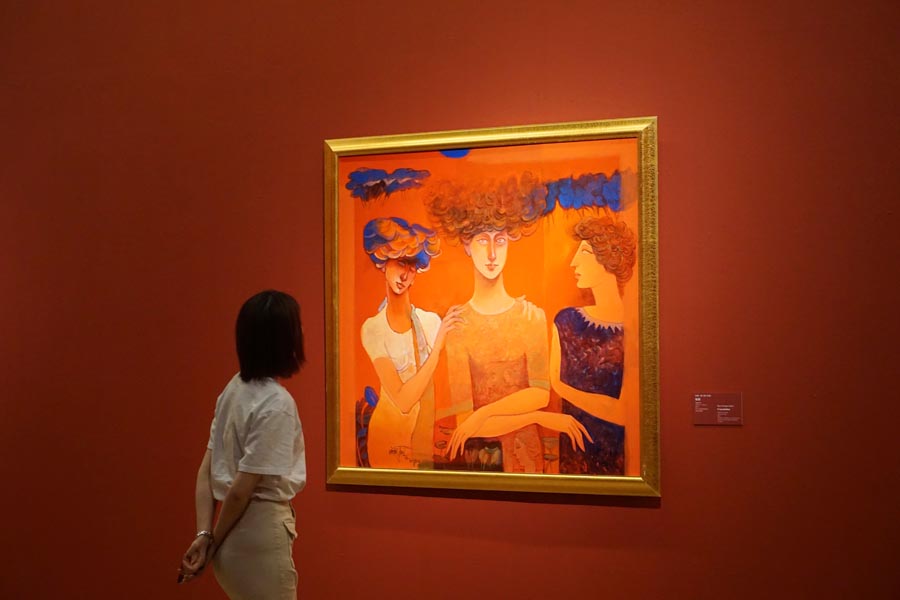 A visitor looks at painting Consolation by Ram Viranjan, India, on May 10, 2019. [Photo by Li Ping/chinadaily.com.cn] |