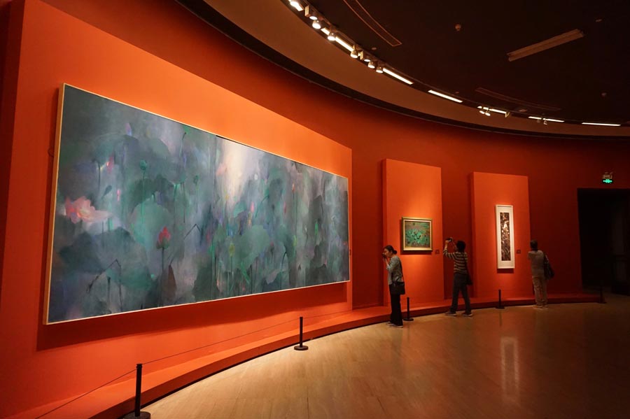 Lotus paintings on display, May 10, 2019. Lotus shares the same pronunciation ( he) as “peace” in Chinese, the works thus implying peace and harmony. [Photo by Li Ping/chinadaily.com.cn]