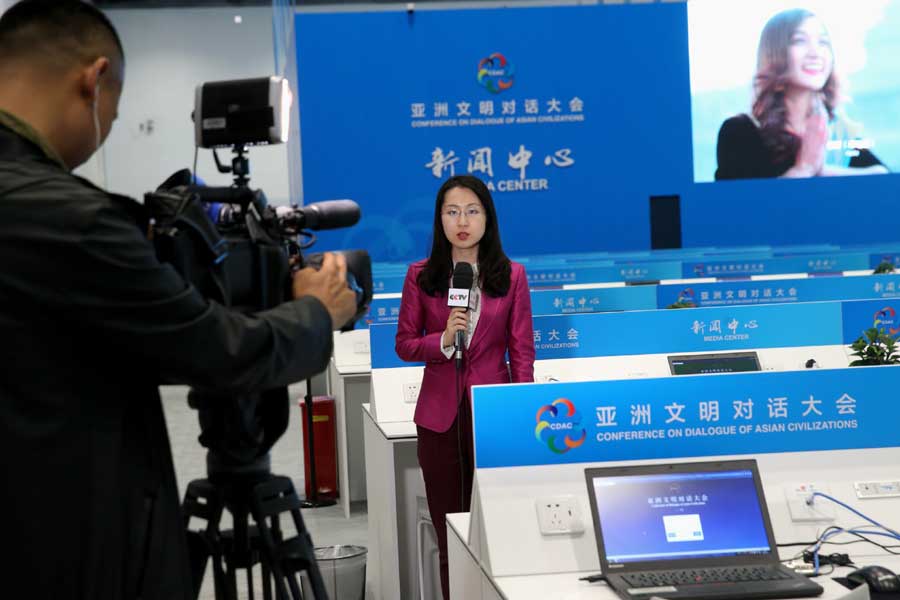 Media reporters work in the media center of the Conference on Dialogue of Asian Civilizations (CDAC) in Beijing, China, May 13, 2019. The Media center of Conference on Dialogue of Asian Civilizations starts trial operation on May 12. [Photo by Wang Zhuangfei/chinadaily.com.cn]