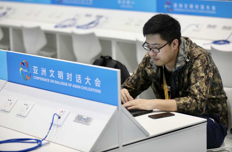 A media reporter works in the media center of the Conference on Dialogue of Asian Civilizations (CDAC) in Beijing, China, May 13, 2019. The Media center of Conference on Dialogue of Asian Civilizations starts trial operation on May 12. [Photo by Zhu Xingxin/chinadaily.com.cn]