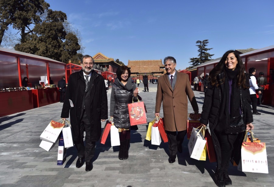 Foreign visitors purchase souvenirs while touring the Palace Museum, Jan 28, 2019.[Photo/Xinhua]
