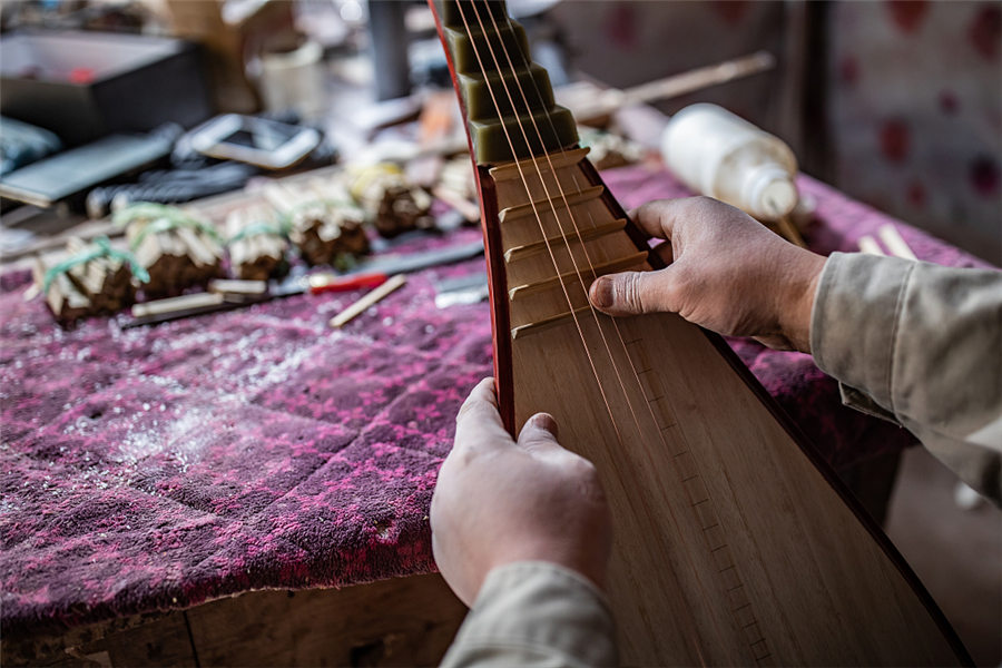 A worker installs strings for a pipa (four-stringed Chinese lute) at Xuchang village, Lankao county, Central China's Henan province, on May 14, 2019. [LanKao Foundation for Poverty Alleviation/VCG]