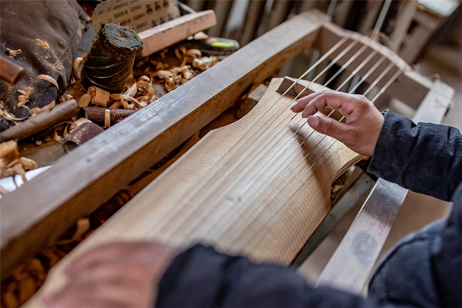 A worker adjusts a guqin, a stringed musical instrument, at Xuchang village. [LanKao Foundation for Poverty Alleviation/VCG]