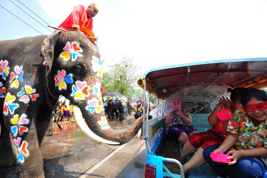 An elephant squirts water over tourists in Ayutthaya, Thailand, on April 11 during the country's traditional WaterSplashing Festival. [Photo/Xinhua]