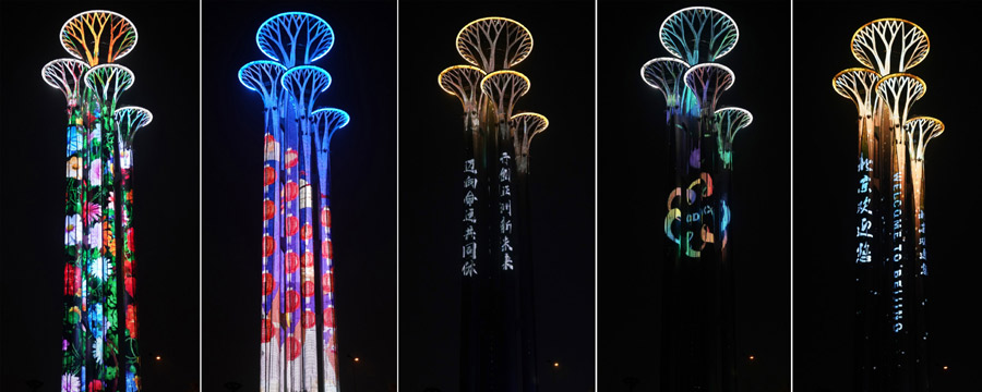 Combo photo taken on May 14, 2019 shows the night view of the Olympic Tower in Beijing, capital of China. Roads and buildings were illuminated Tuesday evening before the upcoming Conference on Dialogue of Asian Civilizations (CDAC) in Beijing. [Photo/Xinhua]