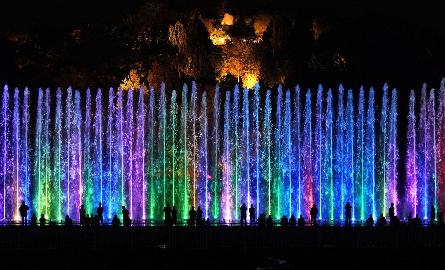 Tourists enjoy a light show at the Olympic Forest Park in Beijing, capital of China, May 14, 2019. Roads and buildings were illuminated Tuesday evening before the upcoming Conference on Dialogue of Asian Civilizations (CDAC) in Beijing. [Photo/Xinhua]
