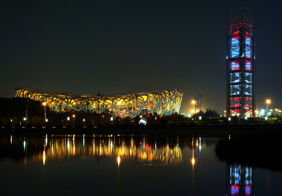 Photo taken on May 14, 2019 shows the night view of the National Stadium, also known as the Bird's Nest, and the Linglong Tower in Beijing, capital of China. Roads and buildings were illuminated Tuesday evening before the upcoming Conference on Dialogue of Asian Civilizations (CDAC) in Beijing. [Photo/Xinhua]