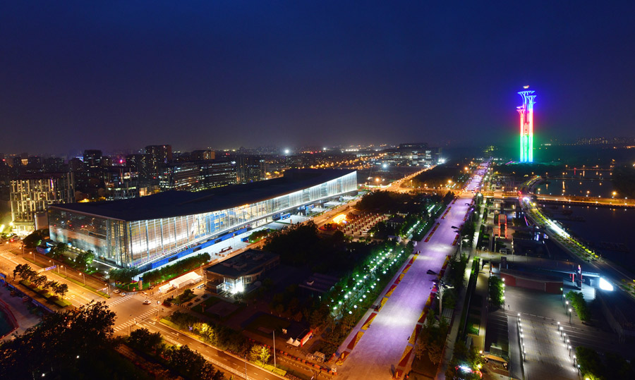 Photo taken on May 14, 2019 shows the night view of the China National Convention Center and the Olympic Tower in Beijing, capital of China. Roads and buildings were illuminated Tuesday evening before the upcoming Conference on Dialogue of Asian Civilizations (CDAC) in Beijing. [Photo/Xinhua]
