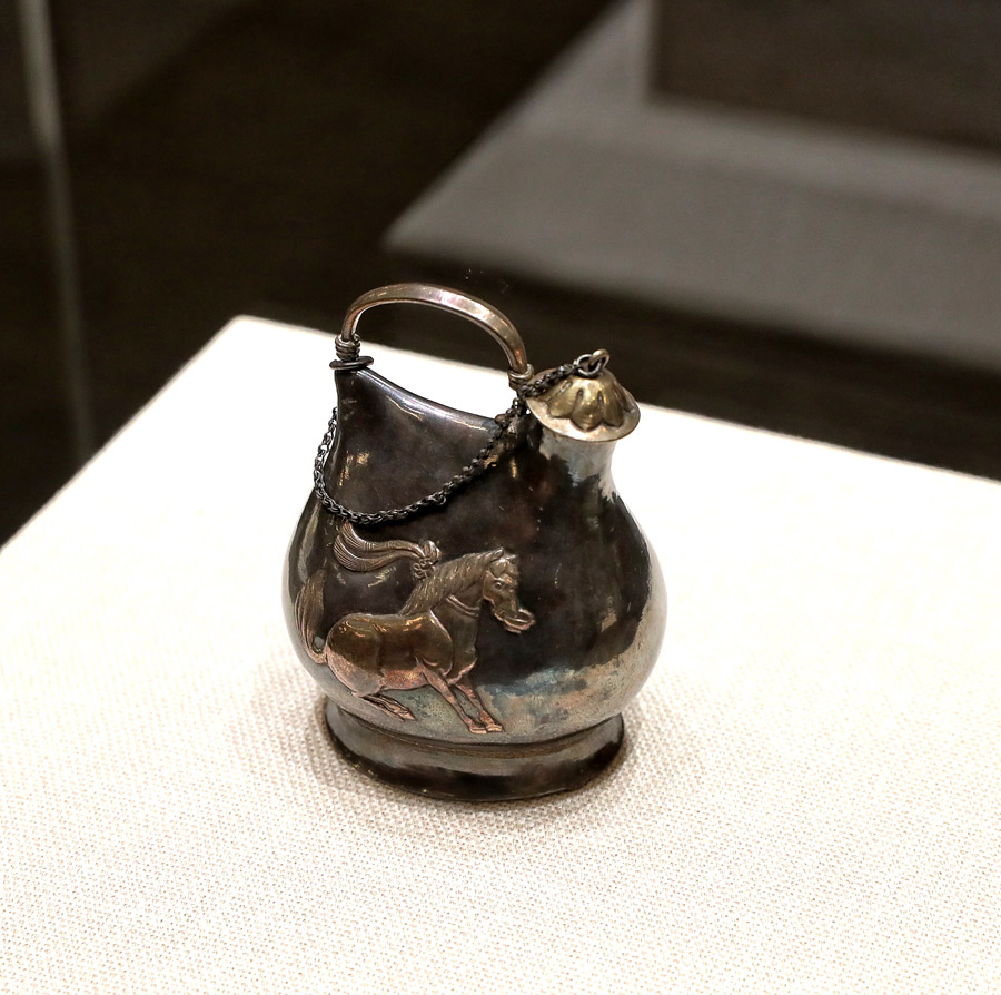 Tang Dynasty (618-907) silver pot in the shape of a leather bag, which reflects communication and the combination of Han culture and nomadic traditions, Shaanxi History Museum. [Photo provided to China Daily]