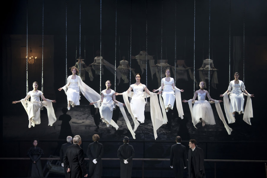As seen on the poster for the Vakhtangov Theatre's production of Eugene Onegin, young ballerinas perform in midair from swings suspended high above the stage as the play unfolds beneath them.