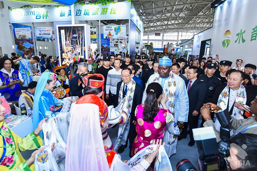Luo Shugang, center, China's Minister of Culture and Tourism, greets officials and guests at the Asian Culture and Tourism Exhibition in Beijing. [Photo provided to China Daily]