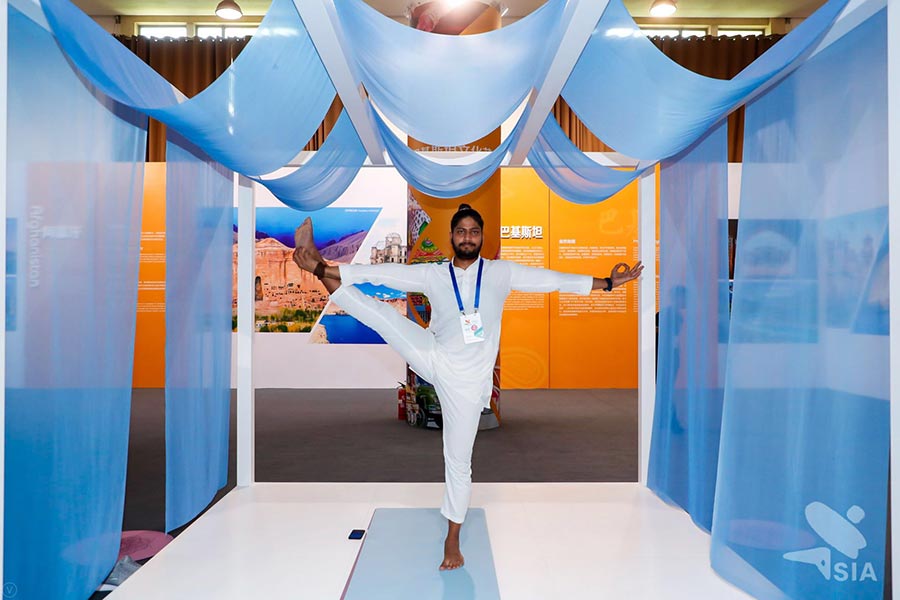 A guest practices yoga at the Asian Culture and Tourism Exhibition. [Photo provided to China Daily]
