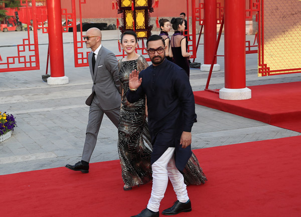 Chinese actress Zhang Ziyi (center), together with Indian star Aamir Khan (right) and Russian film director Fedor Bondarchuk, take to the red carpet at the launch of Asian Film and TV Week on Thursday in Beijing.?[Photo provided to China Daily] |
