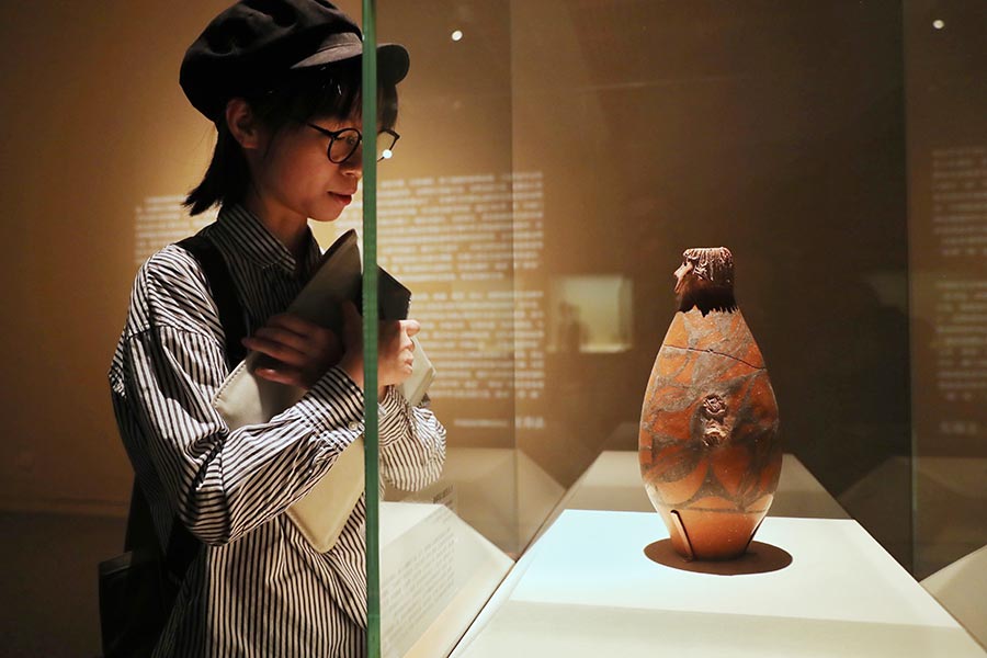 A visitors looks at an artifact shown at exhibition Gateway to the Silk Road. [Photo by Jiang Dong/China Daily] |