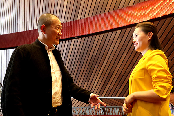 Oscar-winning composer Tan Dun (left) and Chinese soprano Lei Jia at the National Center for the Performing Arts in Beijing on Thursday.[Photo by Jiang Dong/China Daily] |