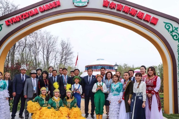 Kyrgyz and Chinese government officials and Kyrgyz students pose for a picture in front of the Kyrgyz pavilion at the Beijing Horticulture Expo in late April.[Photo provided to China Daily] |