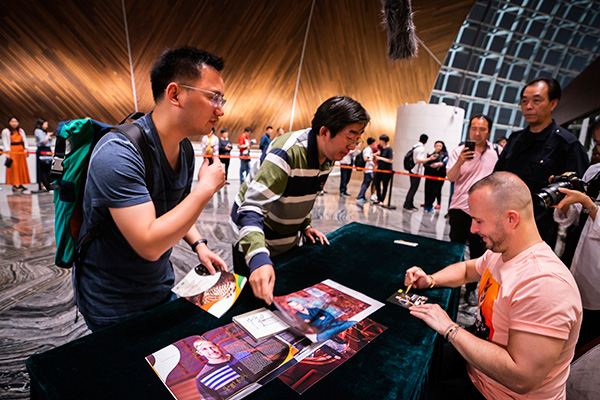 Yannick Nezet-Seguin (seated) signs CDs after the performance at the National Center for the Performing Arts in Beijing on May 17.[Photo provided to China Daily] |