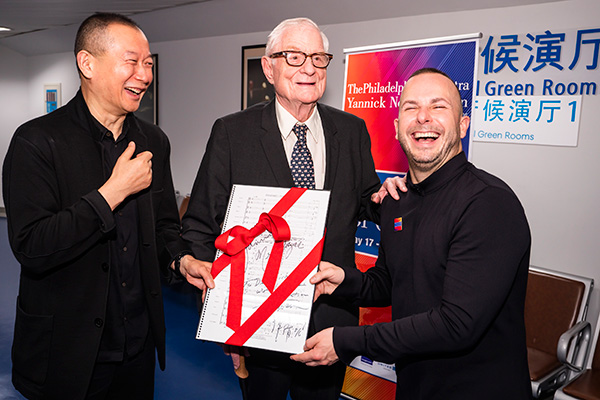 From left: Composer Tan Dun, former US ambassador Nicholas Platt and conductor Yannick Nezet-Seguin.[Photo provided to China Daily] |