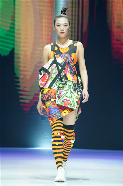 A model walks down the runway with a new design at the fashion show for the First Chengdu University Student Fashion Week, on May 25, 2019. [Photo/Xinhua]