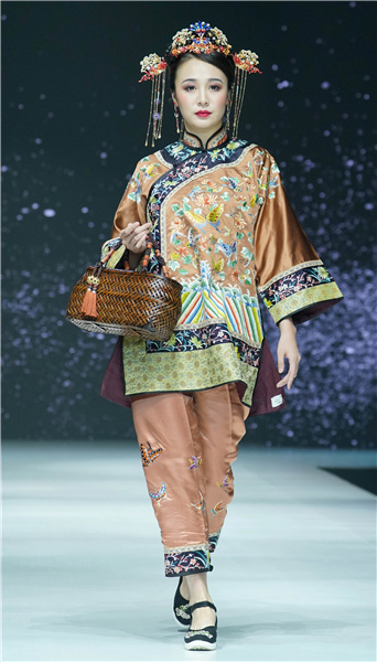 A model walks down the runway with a new design at the fashion show for the First Chengdu University Student Fashion Week, on May 25, 2019. [Photo/Xinhua]