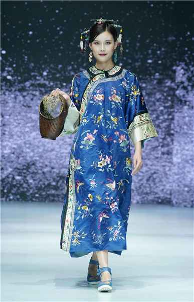 A model walks down the runway with a new design at the fashion show for the First Chengdu University Student Fashion Week, on May 25, 2019. [Photo/Xinhua]