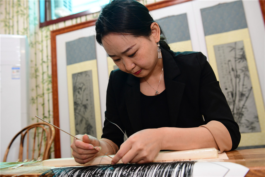 An artist demonstrates the craft of bamboo weaving at a local museum in Huazhou district of Weinan, Northwest China's Shaanxi province, May 28, 2019. [Photo/Xinhua]