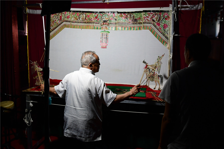 Liu Hua, a shadow puppetry artist, performs at a puppetry art museum in Huazhou district of Weinan, Northwest China's Shaanxi province, May 28, 2019. [Photo/Xinhua]