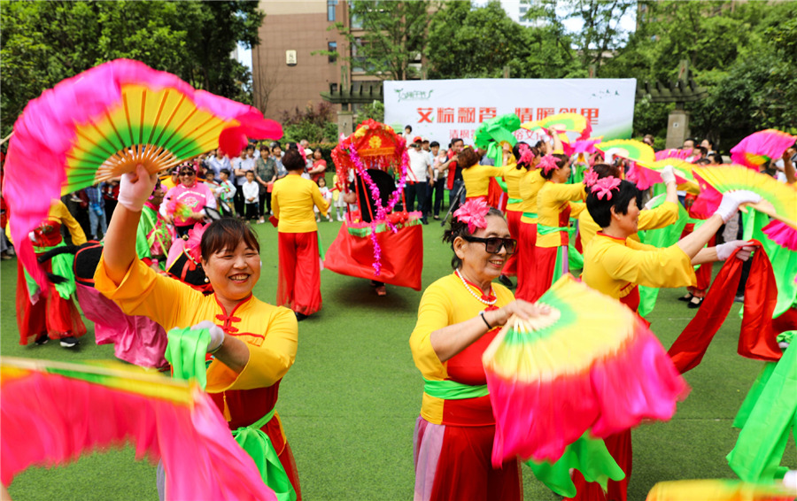 Local residents perform the fan dance during a community celebration for Dragon Boat Festival in Hefei. [Photo/Xinhua]