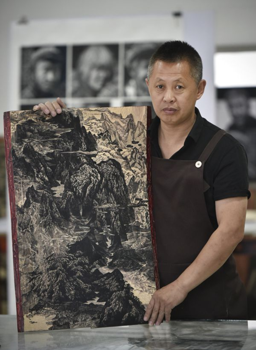 Chen Dongming demonstrates a recently-made wood-block painting at his studio in Huanren county of Benxi, Northeast China's Liaoning province, May 27, 2019. Chen Dongming, a 52-year-old wood-block painter from Wafang village of Huanren county in Benxi, learned the techniques from his grandfather since young. As an inheritor of Huanren wood-block painting, a provincial intangible cultural heritage in Liaoning, Chen has been committed to making a proper integration of traditional Chinese landscape paintings and wood-block New Year paintings to promote the craft in an innovative way. [Photo/Xinhua]