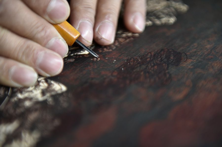 Chen Dongming works on a wood-block painting at his studio in Huanren county of Benxi, Northeast China's Liaoning province, May 27, 2019. Chen Dongming, a 52-year-old wood-block painter from Wafang village of Huanren county in Benxi, learned the techniques from his grandfather since young. As an inheritor of Huanren wood-block painting, a provincial intangible cultural heritage in Liaoning, Chen has been committed to making a proper integration of traditional Chinese landscape paintings and wood-block New Year paintings to promote the craft in an innovative way. [Photo/Xinhua]