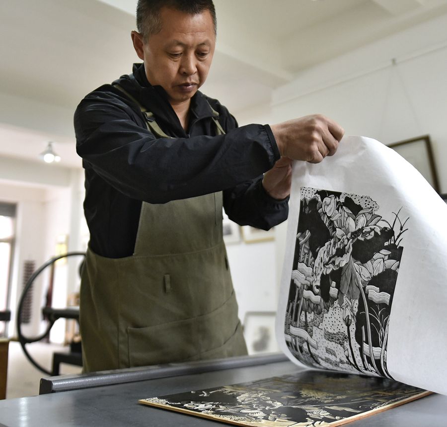 Chen Dongming works on a wood-block painting at his studio in Huanren county of Benxi, Northeast China's Liaoning province, May 27, 2019. Chen Dongming, a 52-year-old wood-block painter from Wafang village of Huanren county in Benxi, learned the techniques from his grandfather since young. As an inheritor of Huanren wood-block painting, a provincial intangible cultural heritage in Liaoning, Chen has been committed to making a proper integration of traditional Chinese landscape paintings and wood-block New Year paintings to promote the craft in an innovative way. [Photo/Xinhua]