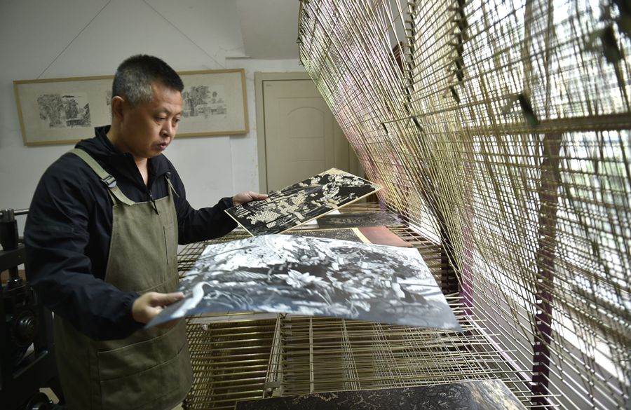 Chen Dongming airs wood-block paintings at his studio in Huanren county of Benxi, Northeast China's Liaoning province, May 27, 2019. Chen Dongming, a 52-year-old wood-block painter from Wafang village of Huanren county in Benxi, learned the techniques from his grandfather since young. As an inheritor of Huanren wood-block painting, a provincial intangible cultural heritage in Liaoning, Chen has been committed to making a proper integration of traditional Chinese landscape paintings and wood-block New Year paintings to promote the craft in an innovative way. [Photo/Xinhua]