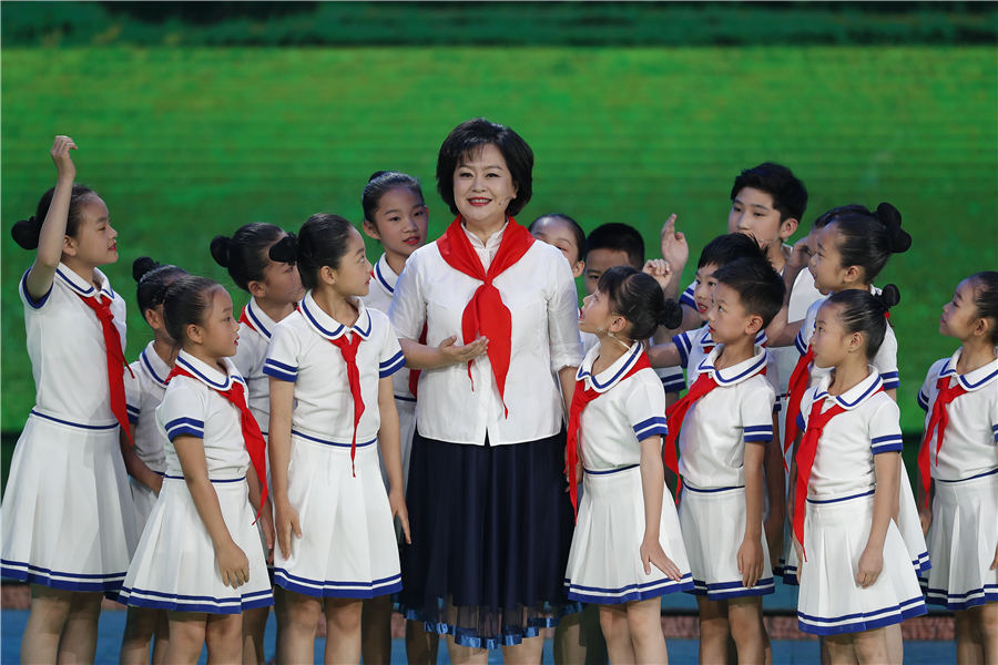 Host Ju Ping (center) performs onstage with young students. [Photo provided to chinadaily.com.cn] |