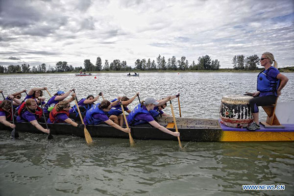 Participants compete on the water during the fourth Steveston Dragon Boat Festival held at Richmond, Canada, Aug 24, 2013. [Photo/Xinhua]