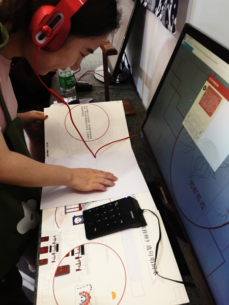 A visitor listens to the Chinese opera and touches the lyrics in Braille thanks to Guo Yanhong's webpage design. [Photo provided to China Daily] |