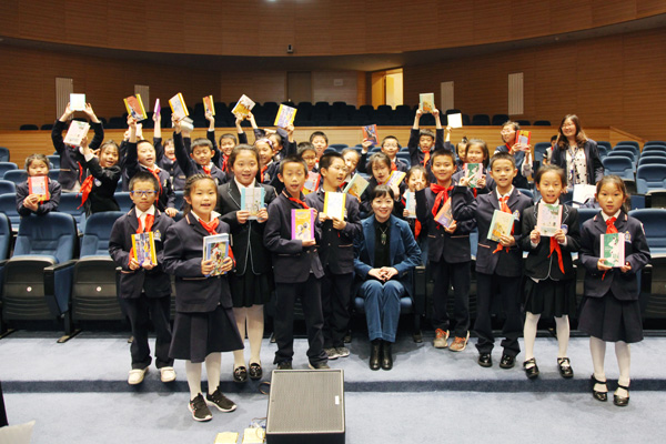 Yin Jianling with a group of youngsters who love reading her books. [Photo provided to China Daily] |